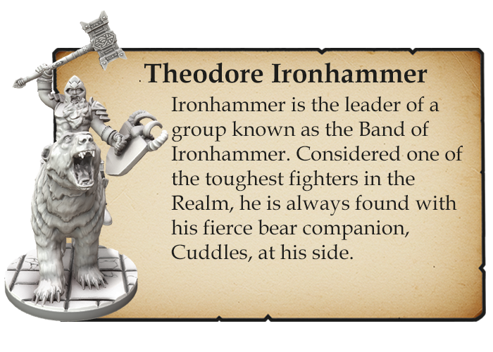 In search of glory and adventure, Ironhammer and Cuddles left the druid tribe and, after many heroic feats, began gathering companions, now known as the Band of Ironhammer. Having led them to countless victories, Theron, King of the Ream, has called on him to fight for The Convergence, promising him vast sums of wealth for his loyalty.